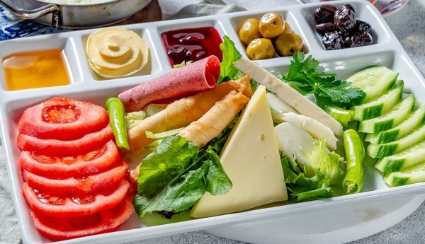 Sucuk, Yumurta,Tahin, Pekmez, Peynir Çeşitleri, Reçel Çeşitleri, Bal, Tereyağ, Zeytin Çeşitleri, Söğüş Tabağı, Yeşillik tabağı, Salam, Saralle, Patates Salatası, Aparatif tabağı( patates kızartması, sigara böreği sosis), Demlik çay, Su. Ekmek.